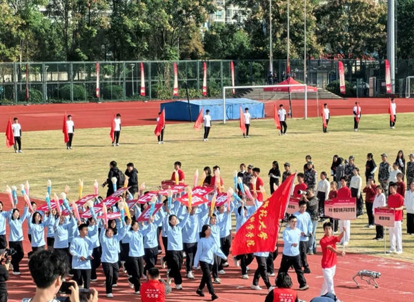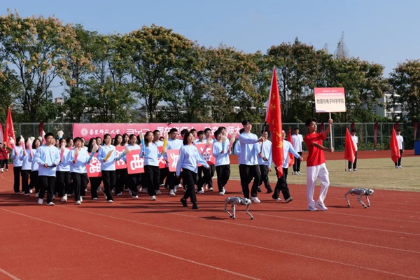 开幕式入场环节,物电学院的学生方阵英姿飒爽、步履铿锵。方阵由39名本科生与2名 “特殊成员”—— 智能机器狗共同组成,以“人机互动”的独特创意与不可阻挡的青春气势走过主席台,并斩获入场式比赛一等奖。