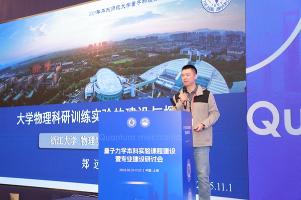 上海交通大学物理与天文学院副院长刘世勇教授提出,应在不同层次课程中对量子物理内容进行差异化设计,满足理工科不同专业学生的学习需求。浙江大学物理实验教学中心副主任郑远高级实验师以“大学物理科研训练实验建设”为题,以金刚石量子计算(含延伸实验)、磁光阱冷原子等实验案例,具体介绍了浙江大学以演示实验和虚拟仿真为基础的课程建设实践。