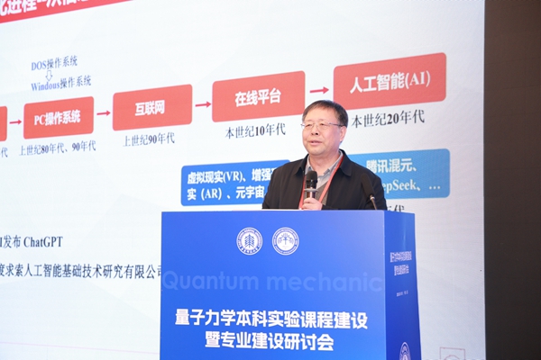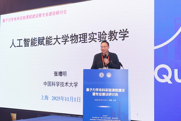 教育部大学物理课程教学指导委员会委员、全国高等学校物理实验教学研究会副理事长、国家级实验教学示范中心联席会物理学科组组长、中国科学技术大学张增明教授以“人工智能赋能大学物理实验教学”为题,聚焦量子信息虚拟仿真实验课程体系建设。他提出“多校共建共享、虚实结合”的建设模式,通过虚拟仿真化解实验难点。随后,他以迈克尔逊干涉仪为例,生动展示了AI在数据可视化、学生能力图谱构建和实验拓展中的应用。