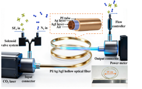 SF₆因其特殊化学性质及优异电气绝缘与高压灭弧性能,在电力、半导体芯片刻蚀、化学冶金与医学诊断等行业领域发挥关键作用。目前SF₆传感器在兼顾超快响应/恢复、高灵敏和低成本等方面还存在极大挑战。为此,本项目提出超快高灵敏度PI空芯光纤SF₆气体传感器的研究方案。方案以自制PI/Ag/AgI空芯光纤作为气室和光传输通道,利用CO₂激光作光源,功率探测器采集信号构建传感器。基于射线模型设计传感器用光纤,采用等离子体处理技术和动态液相沉积法制备柔性、低损耗、高传输可靠性的适用于传感检测的PI/Ag/AgI空芯光纤。基于浓度分析新模型设计嵌入式软件构建螺旋集成型小型化样机。该样机灵敏度达0.39dB/ppm,检测极限低至62.5ppb,响应速度≤3s,且体积小、自动化程度高,有望为工业生产安全和环境保护保驾护航。